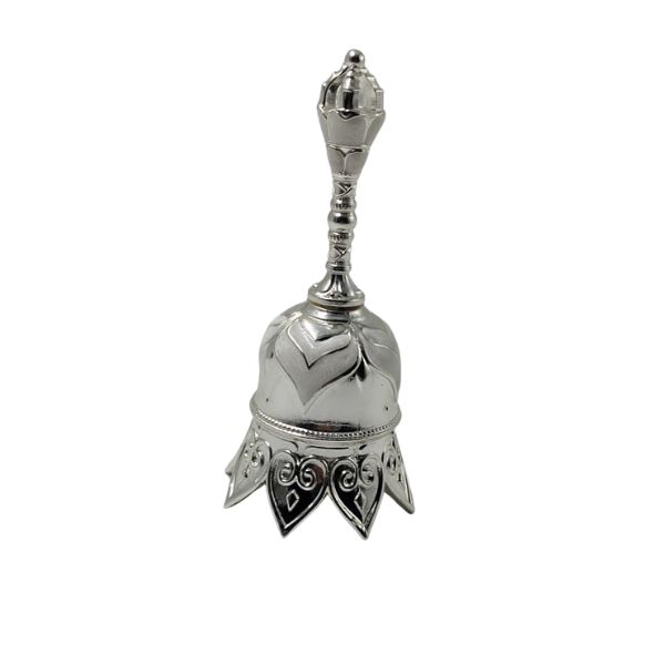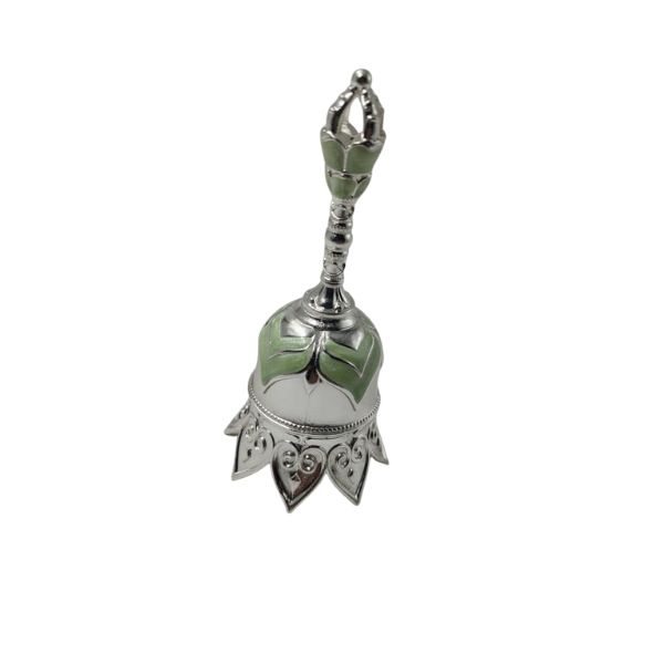 An intricately designed silver-plated decorative bell with green enamel accents, perfect for gifting or d?cor.