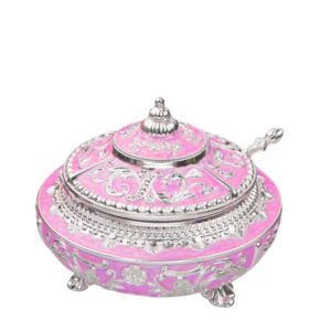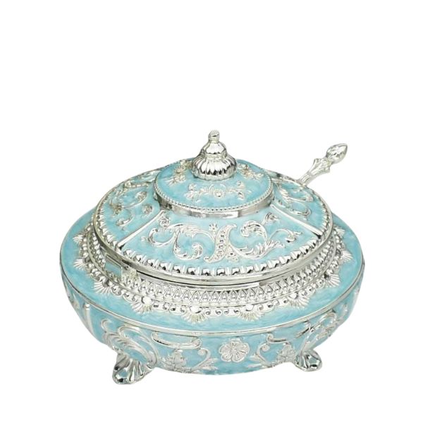 Elegant silver-plated bowl with turquoise enamel detailing, comes with matching lid and spoon.