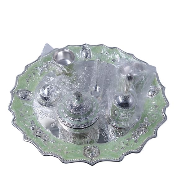 A complete silver-plated pooja thali set with traditional items, beautifully crafted with green enamel accents.